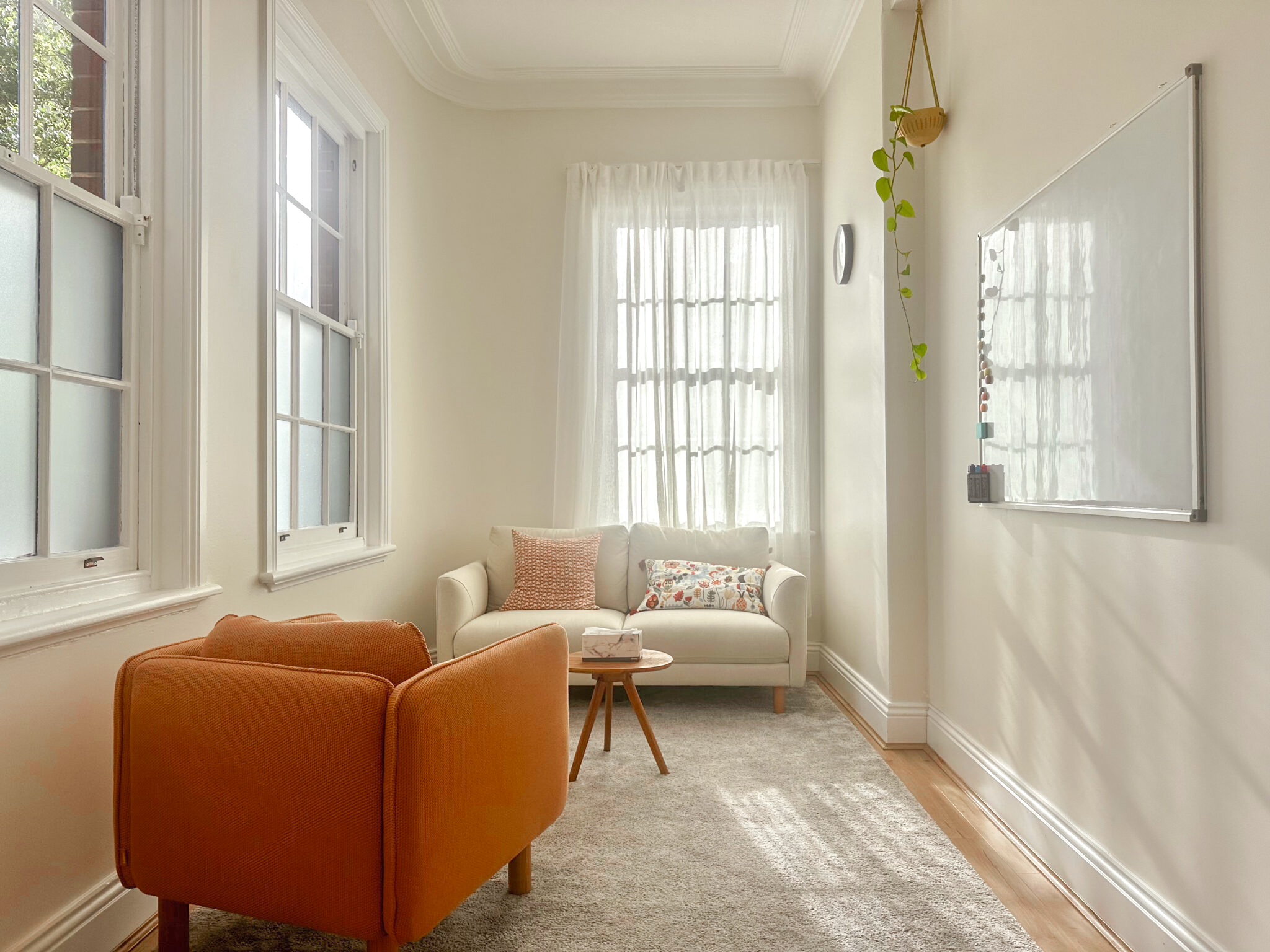 A warm, naturally lit space. Room 2 features a classic feel, whiteboard, shelving, and air conditioning. Perfect for clinicians seeking comfort and functionality.